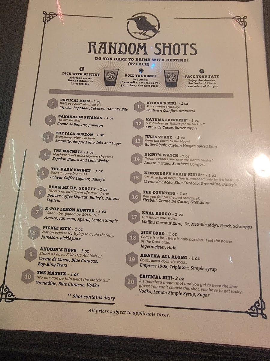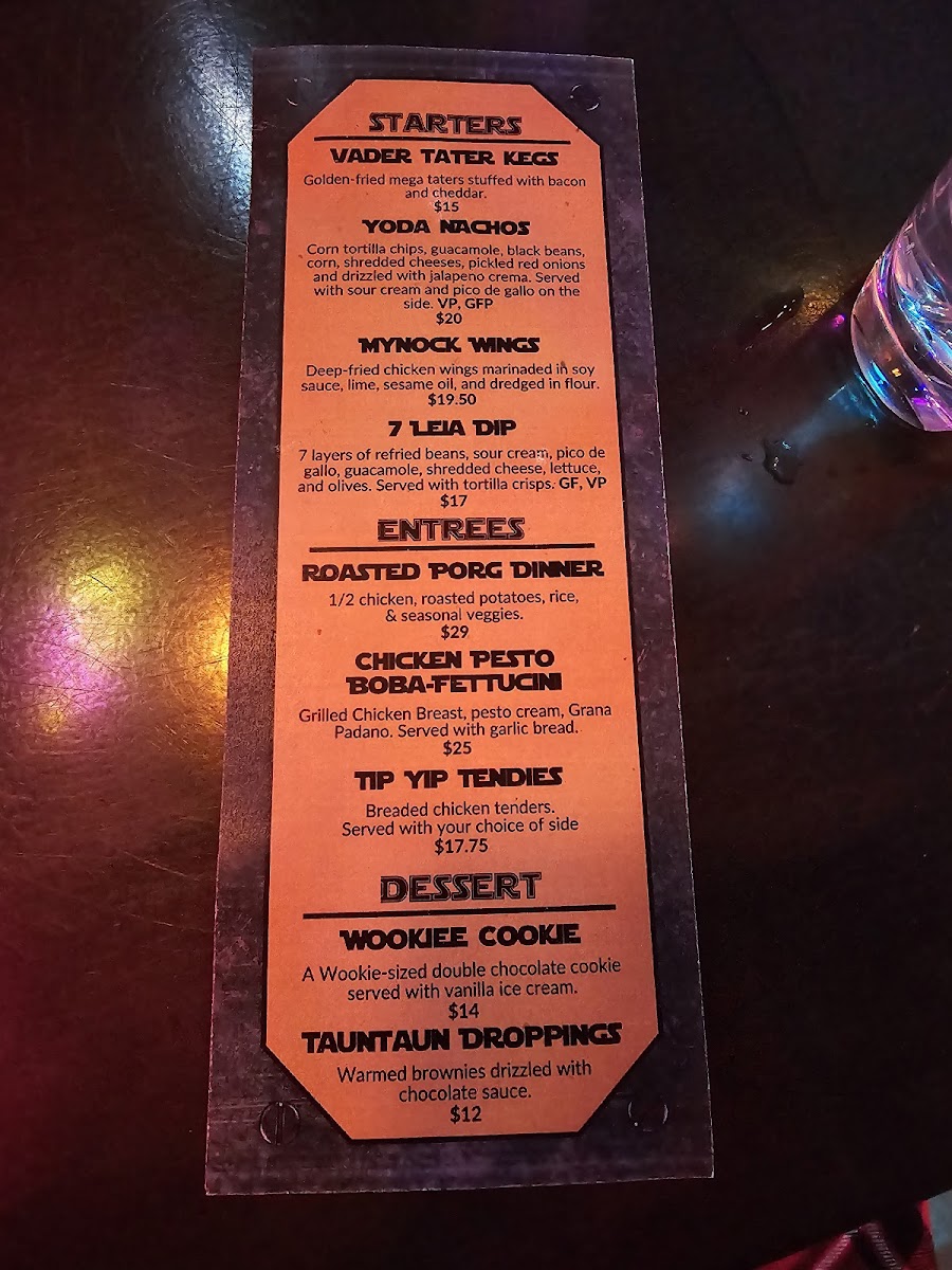 Drinks encompass a variety of creative cocktails and themed beverages, including unique offerings like Romulan Ale, Butterbeer, Jellyfish Shot, and a Beer Flight. This selection is complemented by cocktails that align with the venue’s fantasy theme.