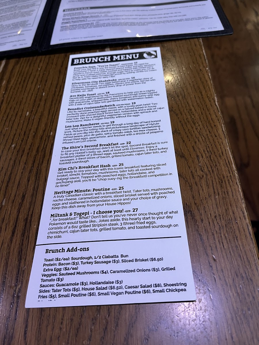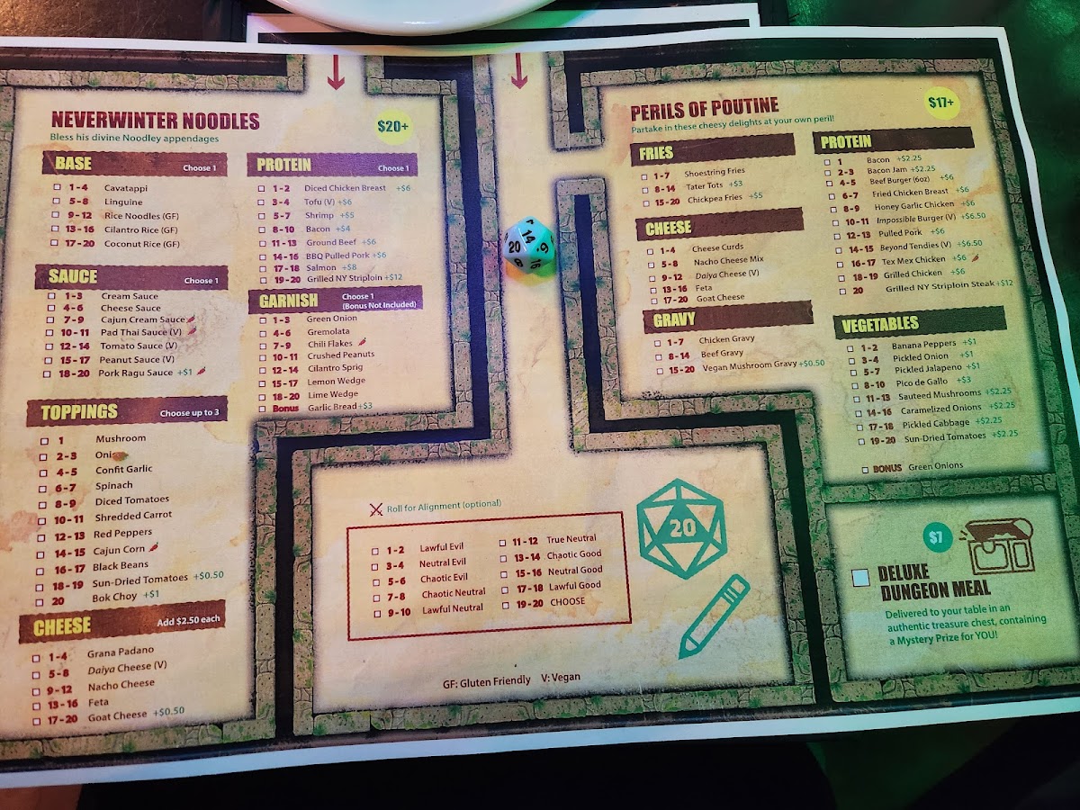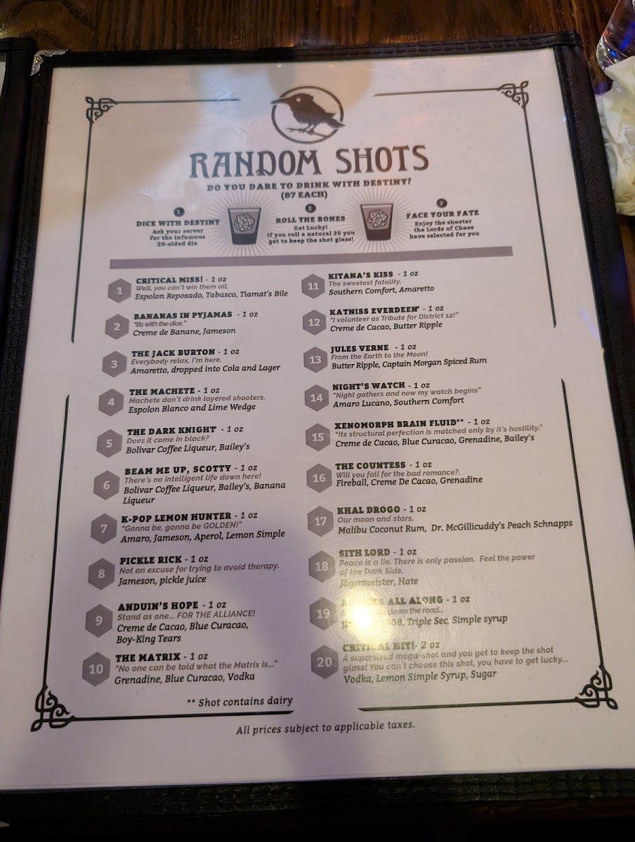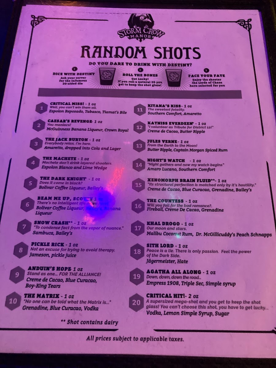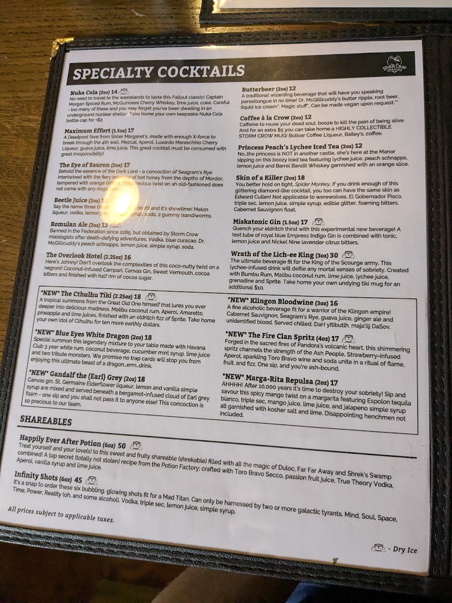 The menu at Storm Crow Manor features a diverse selection of food and drinks inspired by fantasy and pop culture themes. It is structured to offer a variety of options suitable for casual dining, including shareable platters, burgers and sandwiches, salads, and specialty bowls.